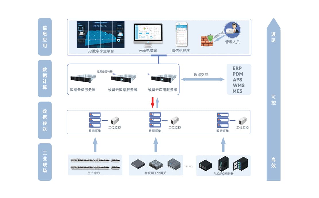 鼎晶云平臺提供設備管理、生產管理、品質管理、數據分析等功能模塊,分類展示生產過程中的所有關鍵指標信息。通過3D數字孿生真實還原設備空間布局,以視覺化KPI看板方式,對設備運行狀態、產能及良率數據進行展示。提供多場景應用模式,通過桌面端和移動端,隨時隨地獲取數據,大大提升決策效率和快速反應能力。